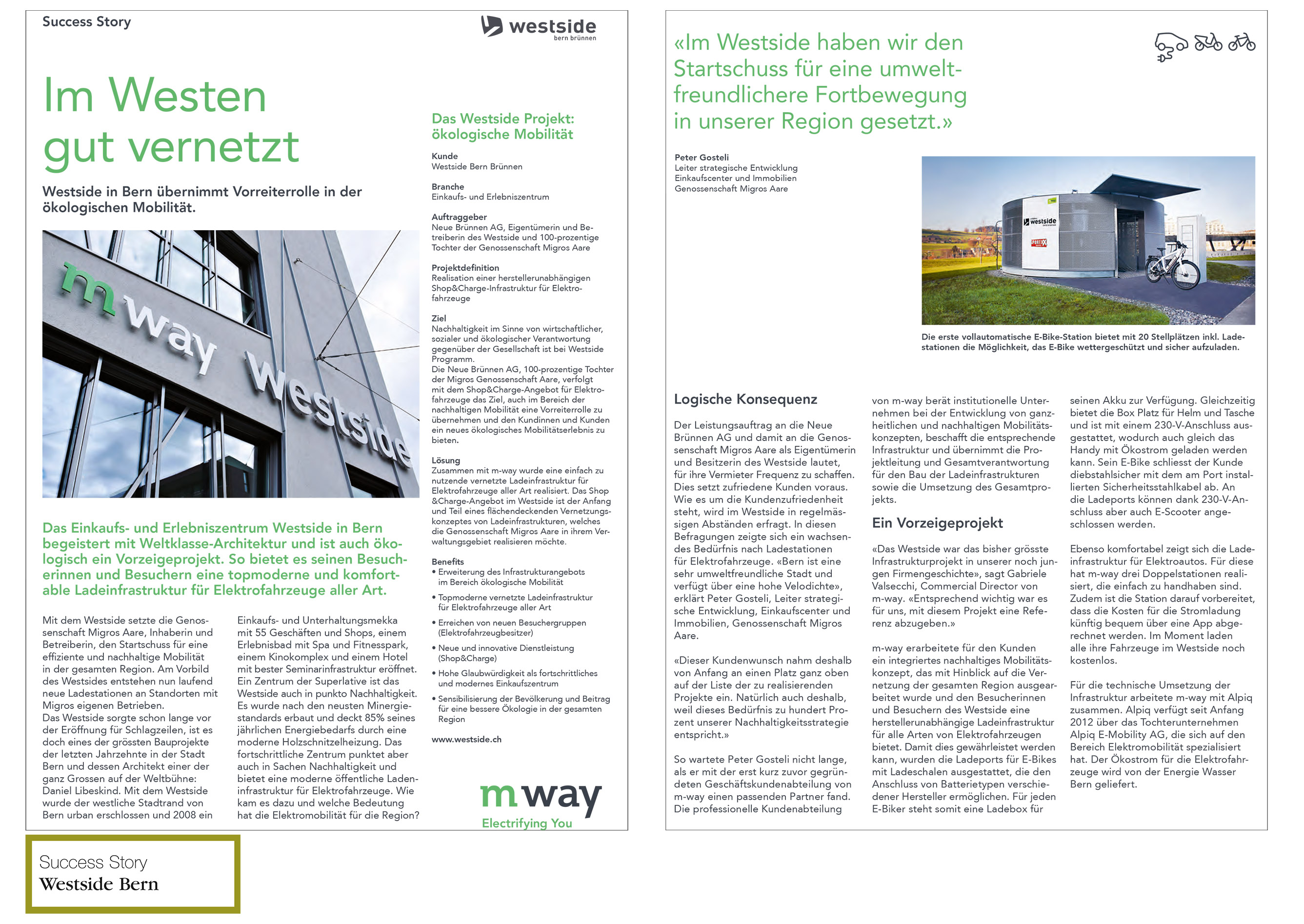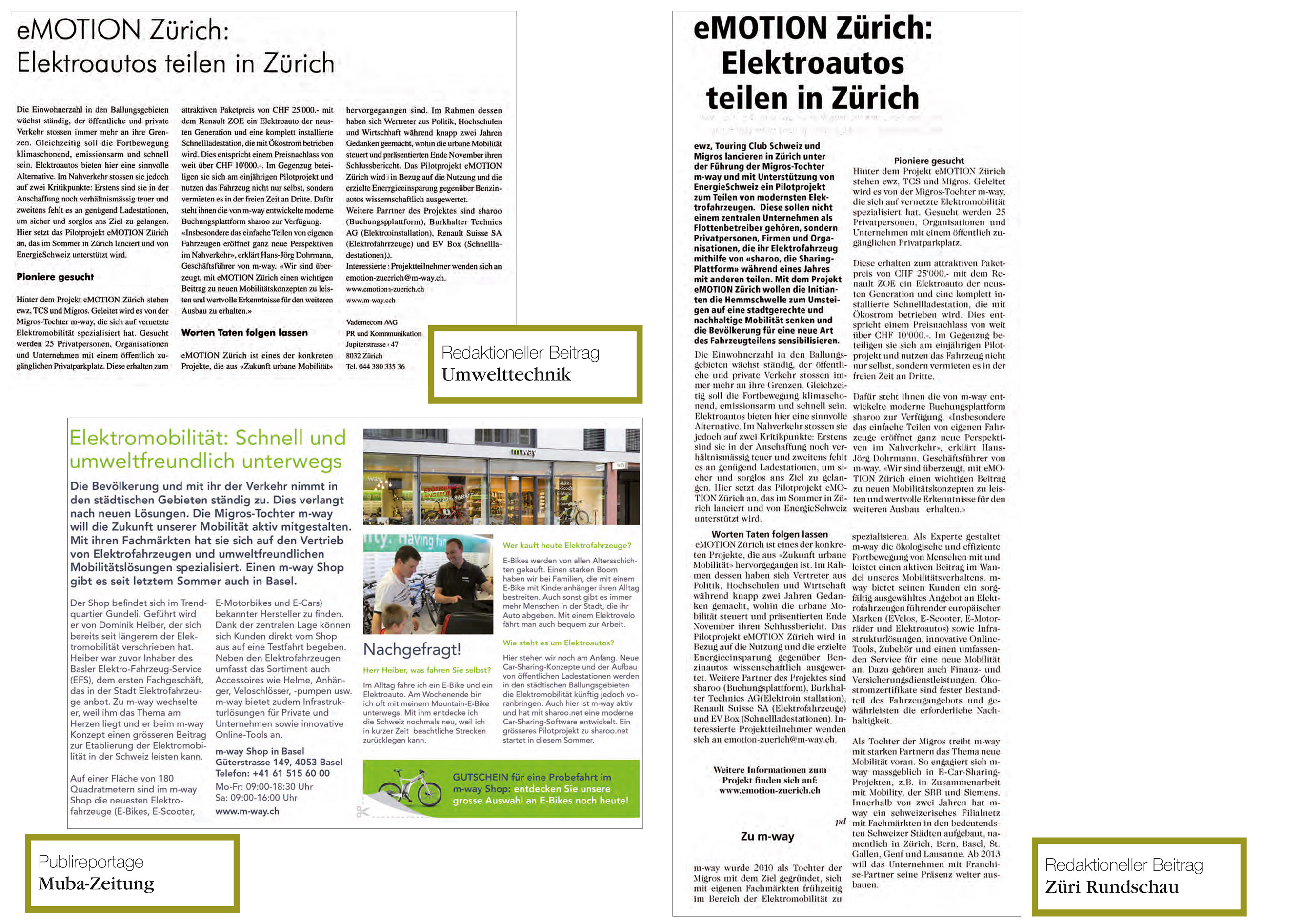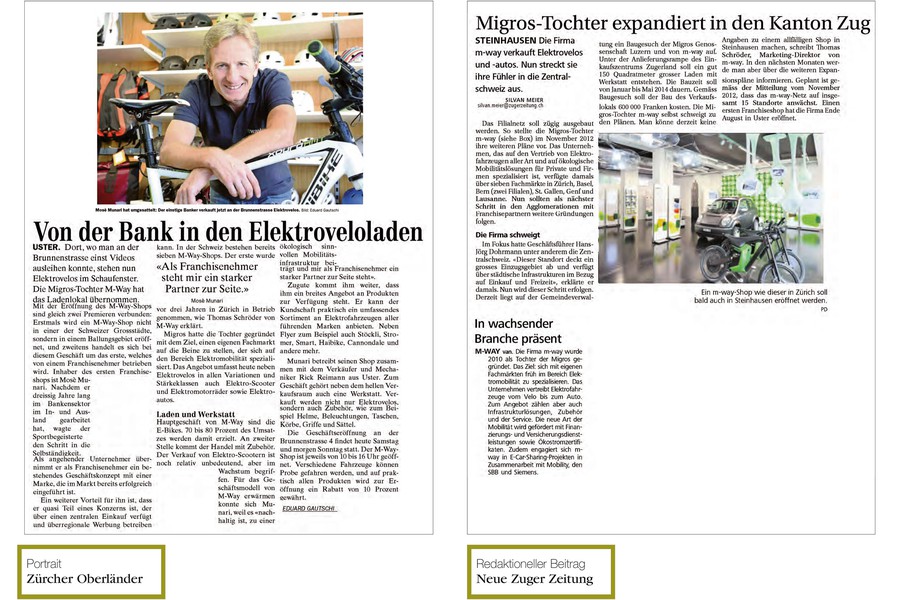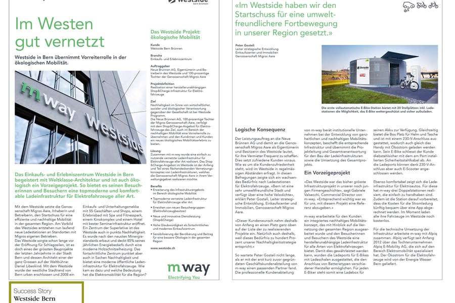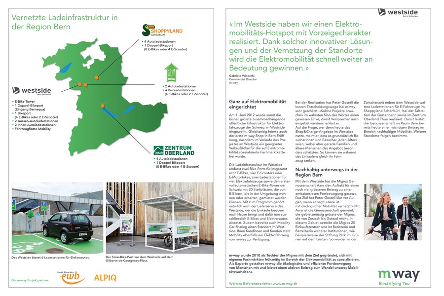 m-way wird 2010 als Tochter der Migros mit dem Ziel gegründet, sich mit eigenen Fachmärkten frühzeitig im Bereich der Elektromobilität zu spezialisieren. Als Experte gestaltet m-way die ökologische und effiziente Fortbewegung von Menschen. vademecom berät und unterstützt m-way im Aufbau der Medienarbeit sowie in Unternehmenskommunikation.
